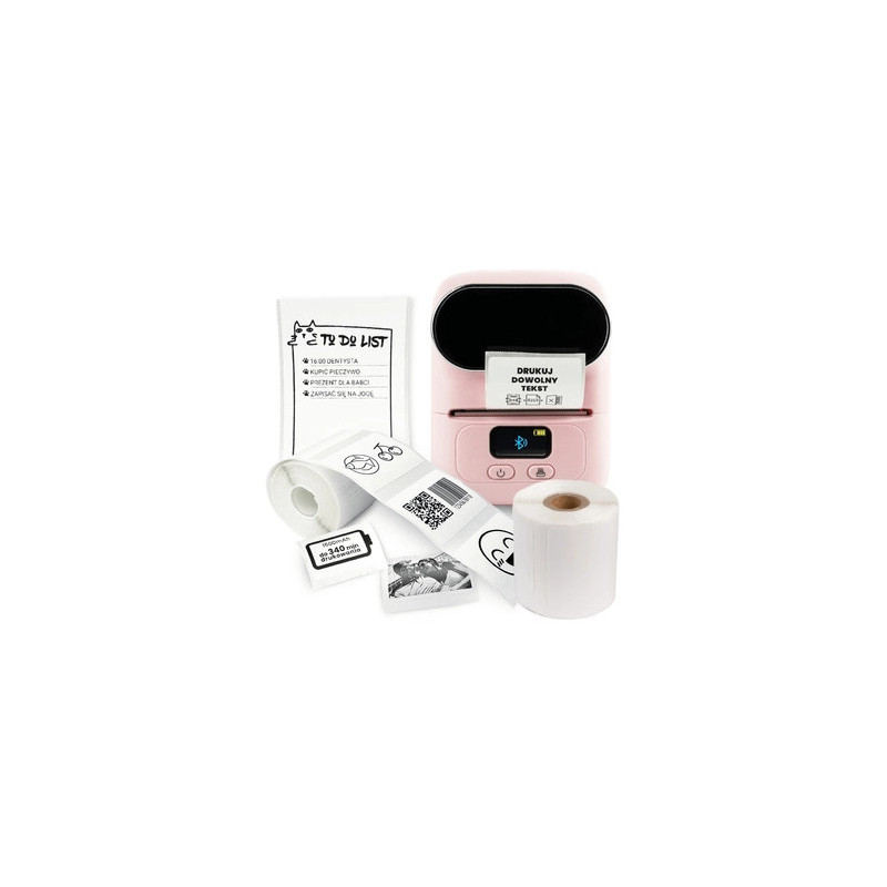 w komplecie znajduje się drukarka w kolorze różowym, rolka z etykietami samoprzylepnymi w rozmiarze 40 na 30 milimetrów w liczbie 230 sztuk wraz z uchwytem o szerokości 50 milimetrów, kabel USB z adapterem, instrukcja użytkowania oraz dodatkowy zestaw etykiet o wymiarach 50 na 30 milimetrów również w liczbie 230 sztuk